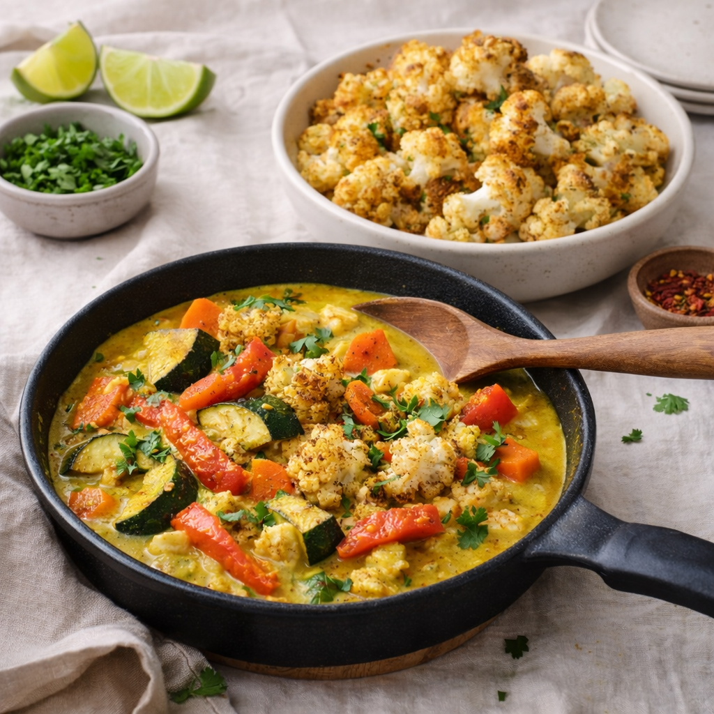Soms wil je een maaltijd die verwarmt, vult en troost biedt, maar dan zonder vlees of zuivel. Dit gerecht bewijst dat je daarvoor niets hoeft te missen. Deze romige kokosgroenten met geroosterde bloemkool zijn volledig paleo-proof, plantaardig en vrij van zuivel, maar wel rijk aan smaak en textuur.