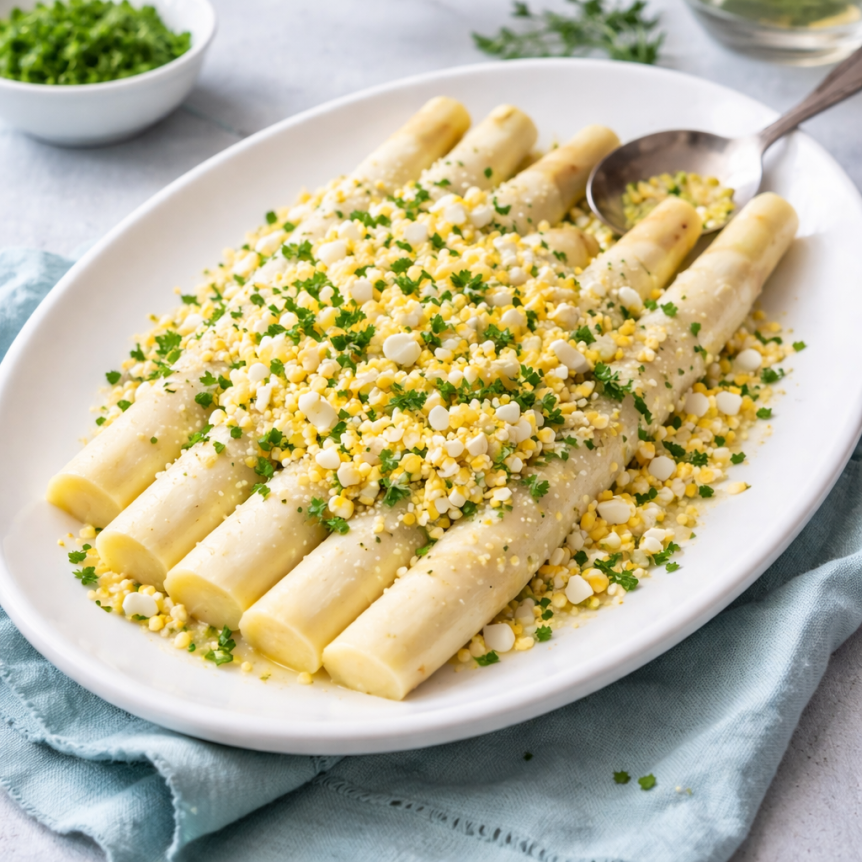 Malse witte asperges, kruimelige eitjes en frisse peterselie worden samengebracht met een subtiele, zachte saus die het geheel mooi rond maakt. Simpel, seizoensgebonden en vol smaak.