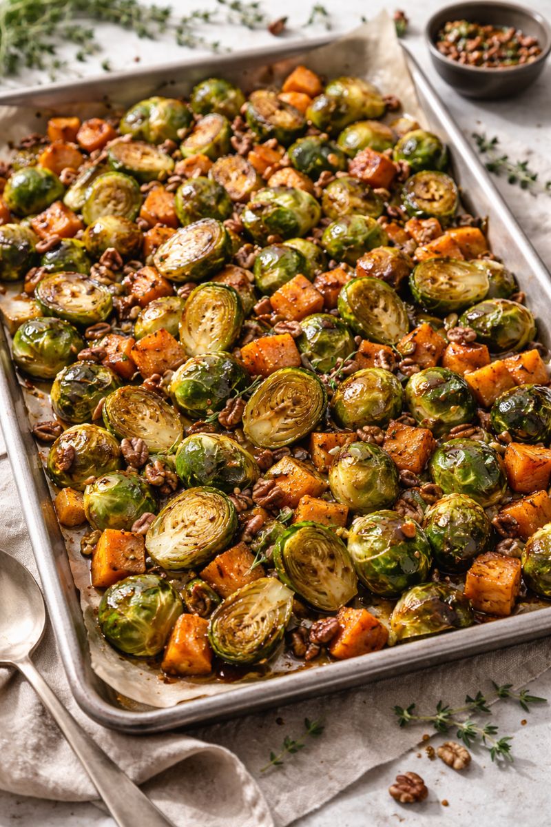Deze traybake is zo’n gerecht dat bewijst hoe lekker simpel kan zijn. Alles gaat op één bakplaat de oven in en komt er goudbruin, gekaramelliseerd en vol smaak weer uit. De combinatie van hartige spruiten, zoete aardappel, frisse tijm en een vleugje balsamico en honing maakt dit tot een echte favoriet.