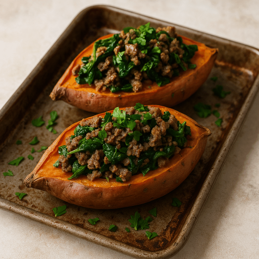 Hartig, voedzaam en boordevol smaak. Deze ovengebakken zoete aardappelen gevuld met kruidig rundergehakt en verse spinazie zijn een perfecte paleo-maaltijd. Makkelijk te maken, rijk aan groenten en afgewerkt met verse kruiden voor een extra frisse toets.